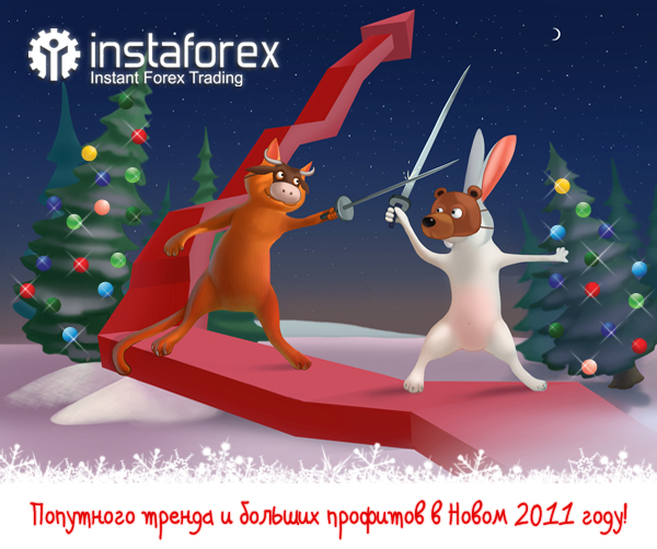 Команда InstaForex желает Вам в Новом 2011 году профессионального роста, положительных прогнозов, попутного тренда и больших профитов, ведь, несмотря на то, что грядущий год будет годом Кота или Кролика, в жизни трейдера каждый год подходит под знаками Быка и Медведя. А если серьезно, то пусть во всем Вам сопутствуют удача и успех, пусть окружающие вдохновляют Вас на значительные дела, а Вы вдохновляете окружающих!