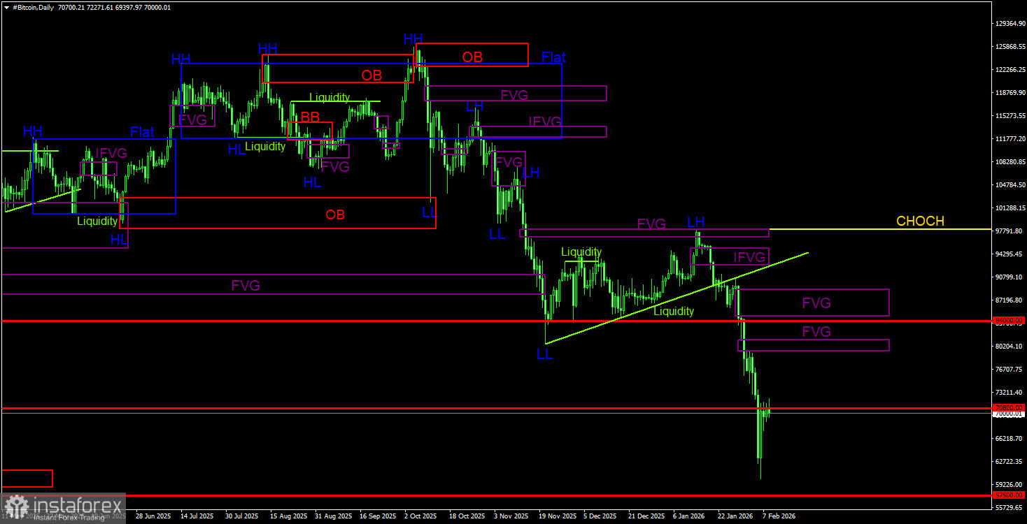 Биткоин продолжает формирование полноценного нисходящего тренда. Мы продолжаем ожидать падения с целью 57 500$(уровень 61,8% по Фибоначчи от трехлетнего восходящего тренда), а признаков разворота тренда или коррекции нет в данное время ни одного. Из областей POI на продажу на дневном ТФ можно отметить последний «медвежий» FVG, до которого биткоину еще очень далеко. Падение может возобновиться и без отработки ближайшей области POI.