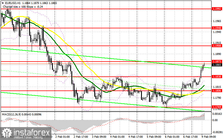 Сильный рост индикатора уверенности инвесторов от Sentix до уровня в 4,2 пункта позволил евро продолжить восстановление в паре с американским долларом. Во второй половине дня нет статистики по США, так что внимание будет сконцентрировано на выступлениях представителей ФРС в лице Кристофера Уоллера и Рафаэля Бостика. Их мягкий тон может спровоцировать еще одну волну снижения доллара. Однако вряд ли до выхода важных данных по инфляции и рынку труда США, которые ожидаются на этой неделе, мы услышим какие-либо кардинальные изменения в заявлениях представителей ФРС. При сценарии снижения пары после выступлений членов FOMC, лишь формирование ложного пробоя в районе поддержки 1.1838 по аналогии с тем, что я разбирал выше, даст точку входа в длинные позиции в расчете на восстановление евро и тест сопротивления 1.1873. Прорыв и обратный тест этого диапазона сверху вниз станут подтверждением правильной точки вход с движением к области 1.1908. Самой дальней целью будет уровень 1.1948, где буду фиксировать прибыль. При варианте снижения EUR/USD и отсутствия активности в районе 1.1838, евро может просесть более крупно. Это приведет к снижению в район 1.1806. Лишь после формирования там ложного пробоя собираюсь действовать на покупку евро. Открывать длинные позиции сразу на отскок планирую от 1.1769 с целью восходящей коррекции в 30-35 пунктов внутри дня.
