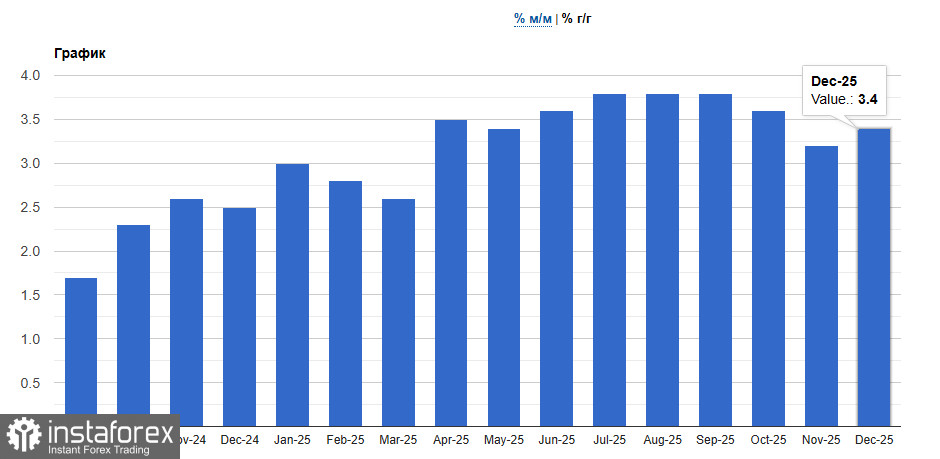Согласно данным управления национальной статистики, потребительские цены в декабре 2025 года выросли на 3,4% по сравнению с аналогичным периодом прошлого года, что выше показателя в 3,2% в предыдущем месяце. Экономисты прогнозировали рост на 3,3%.