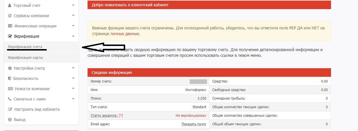 Зайдите в клиентский кабинет. Выберите раздел “Верификация”-”Верификация счета” в боковой панели слева.