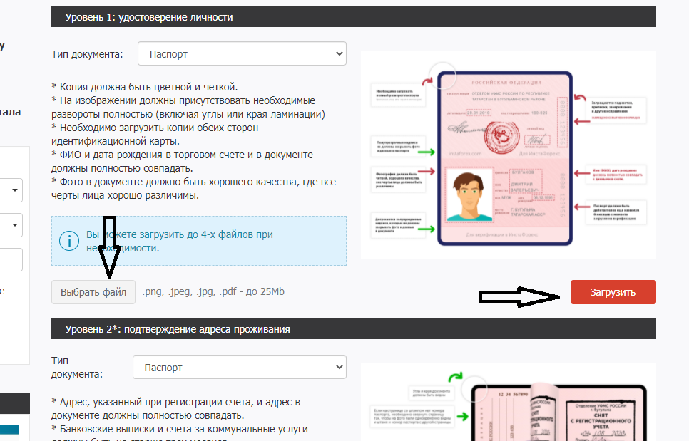 Убедитесь, что файлы, которые вы собираетесь загрузить для верификации, правильного формата. Допустимые форматы загружаемых файлов: .png, .jpeg, .jpg, .gif и .pdf. Суммарный объем файлов, загружаемых на верификацию каждого уровня не должен превышать 25 МБ. Разрешение файла должно быть не менее 400 пикселей.