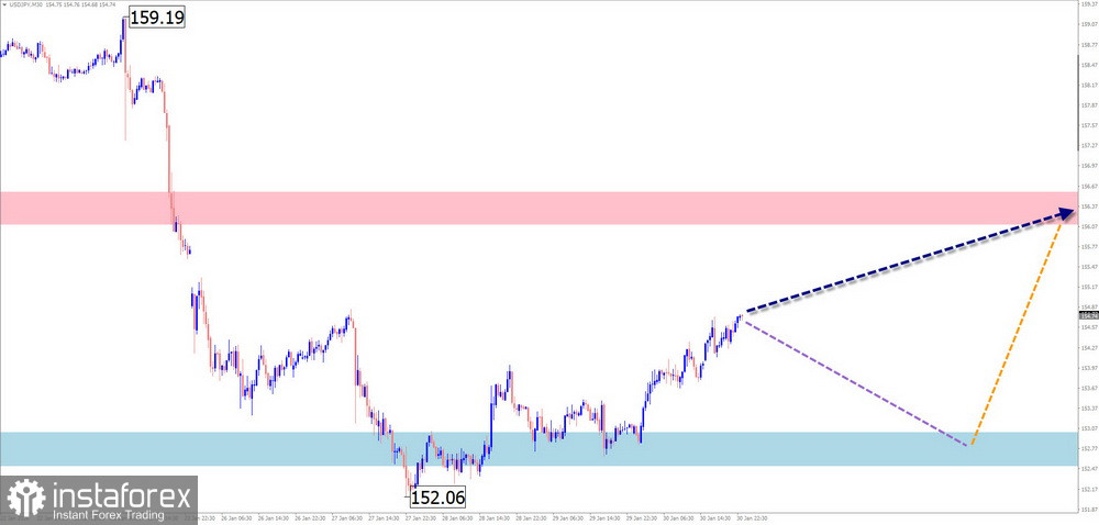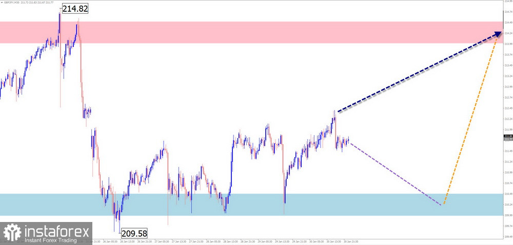 บนกราฟของคู่สกุลเงินเยนญี่ปุ่นต่อปอนด์อังกฤษ โอกาสการซื้อขายที่น่าสนใจที่สุดคือลูกคลื่นขาขึ้นล่าสุดที่เริ่มต้นเมื่อวันที่ 9 เมษายนของปีที่แล้วและยังไม่เสร็จสิ้น ภายในโครงสร้างคลื่น มีส่วนขาขึ้นที่มีศักยภาพในการกลับตัวเริ่มต้นเมื่อวันที่ 26 มกราคม หากยืนยันแล้ว ส่วนสุดท้าย (C) จะเริ่มขึ้น