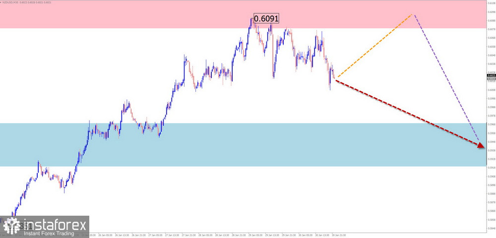 บนกราฟของคู่เงินหลักดอลลาร์นิวซีแลนด์ โครงสร้างคลื่นที่ยังไม่เสร็จมีทิศทางขาขึ้นและมีมาตั้งแต่เดือนเมษายนของปีที่แล้ว ส่วนสุดท้ายของคลื่น (C) เริ่มต้นในเดือนพฤศจิกายน ในขณะที่กำลังวิเคราะห์ คลื่นนี้ยังไม่เสร็จสมบูรณ์ ราคากำลังดึงกลับลงจากขอบล่างของโซนกลับทิศทางที่อาจเกิดขึ้น