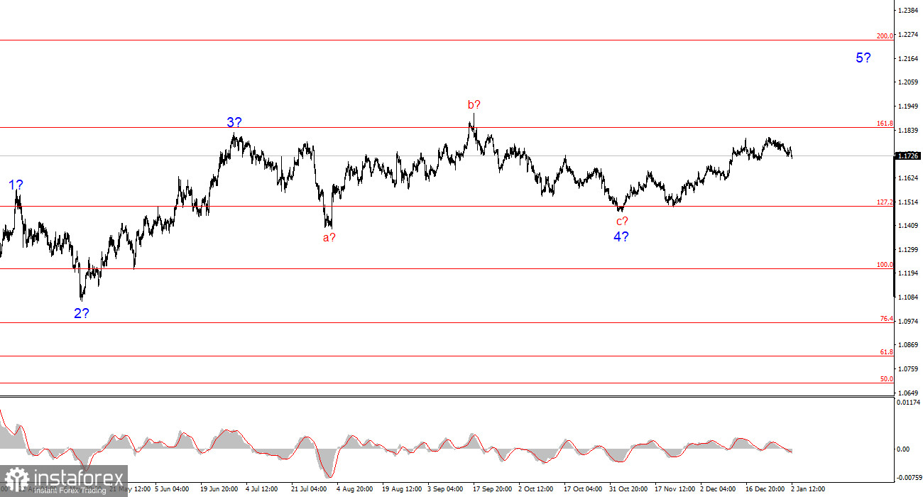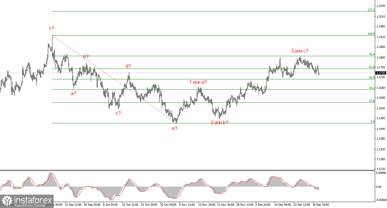 Волновая разметка 4-часового графика для инструмента EUR/USD имеет вполне понятный, хоть и довольно сложный вид в последние месяцы. Об отмене повышательного участка тренда, который берет свое начало в январе прошлого года, речи не идет, но волновая структура, начиная с 1 июля 2025 года, приняла сложный и протяженный вид. На мой взгляд, инструмент завершил построение коррекционной волны 4, которая приняла очень нестандартный вид. Внутри этой волны мы наблюдали исключительно коррекционные структуры, поэтому сомнений в коррекционном характере этой волны не возникает никаких.